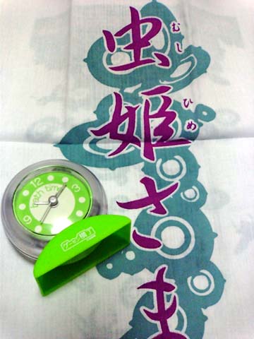 CAVEのシューティングゲーム「虫姫さま」の手ぬぐいと携帯電話アプリサイト「ゲーセン横丁」のロゴ入りバスクロックです。